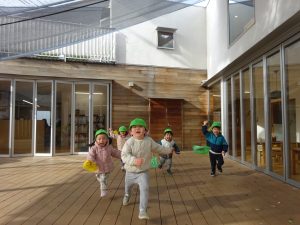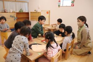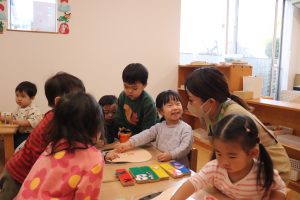 あたらしい年になり寒い日が続いていますがつぼみっこたちは元気いっぱい。お正月ならではの遊び、こま回しや福笑い、たこあげなど昔ながらの遊びにみんな夢中になって遊んでいます。