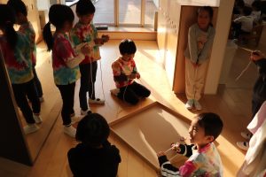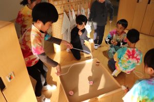 大きい組さんたちはこま回しにチャレンジ!はじめはこまに紐を巻き付けるのが少し難しかったおともだちもいましたが巻くのを手伝ってもらったりたくさん練習して上手に巻けるようになりました。今では技にも挑戦したりお友だち同士で教えあったり応援し合ったりしています。